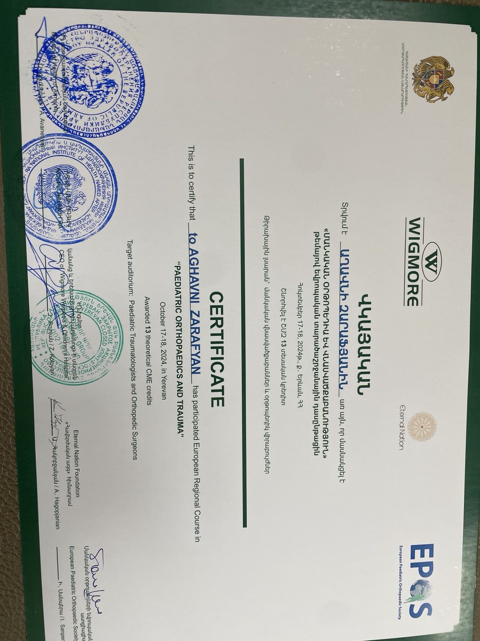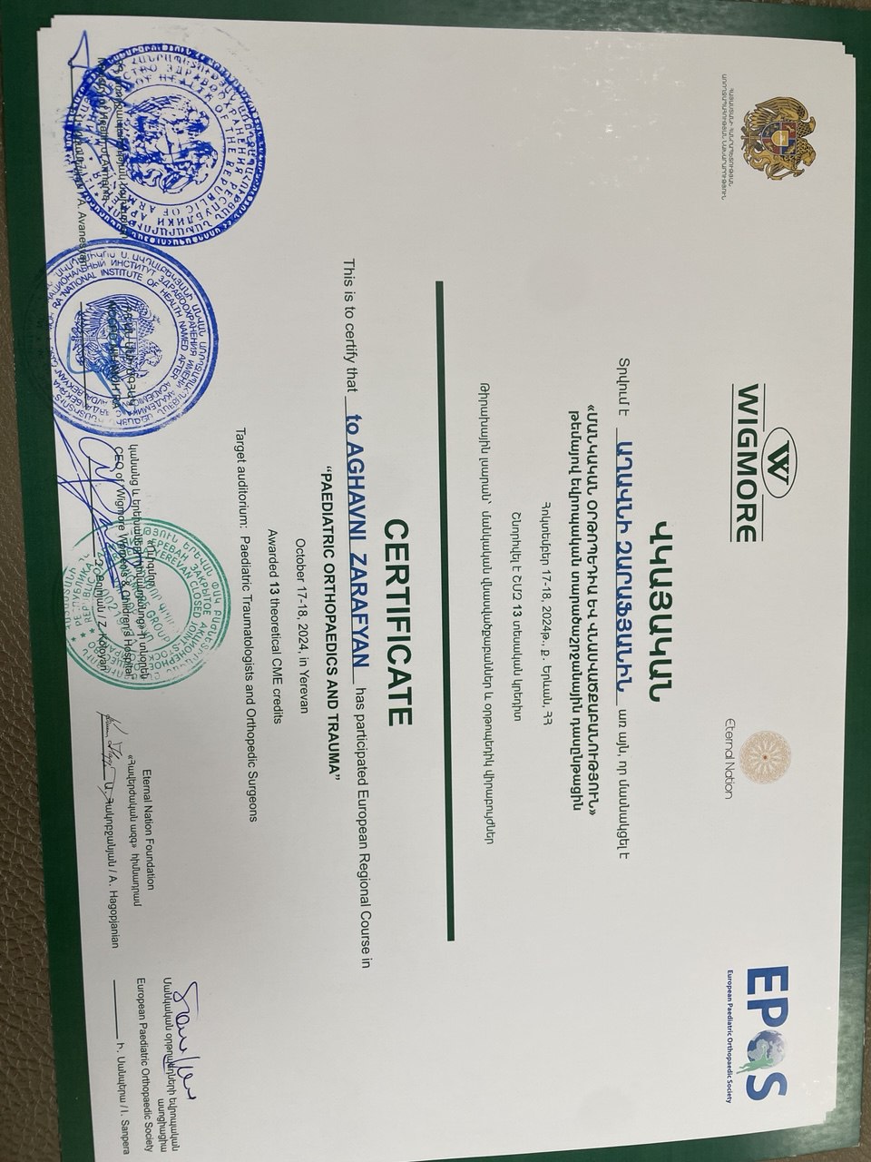 1991–1993 թթ. — Մանկական վերականգնողաբանության ուսուցում «Project Hope» ծրագրի շրջանակում — Բժիշկ վերականգնողաբանի դիպլոմ