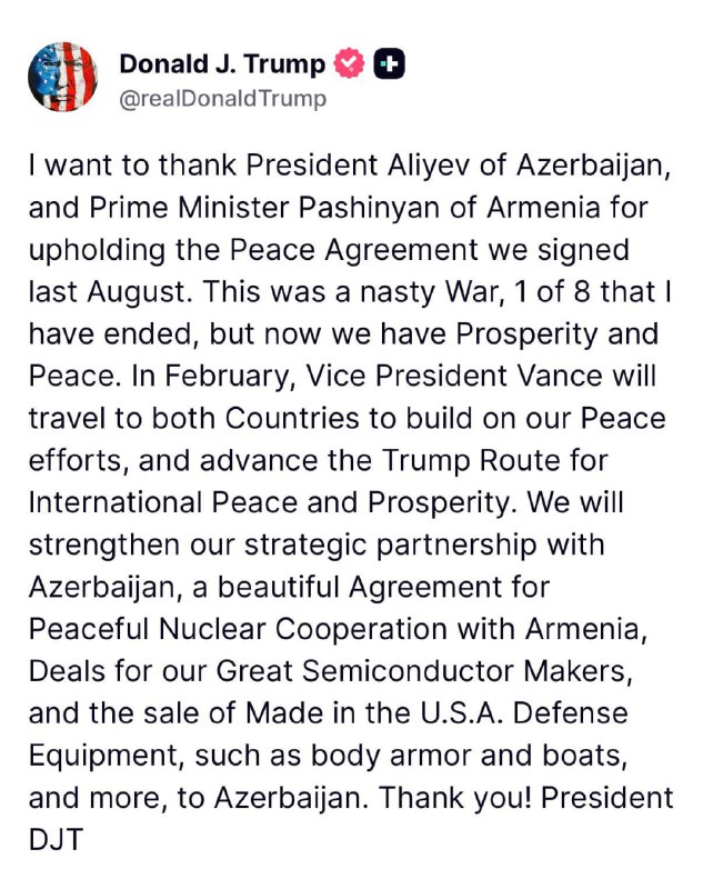 Փետրվարի ընթացքում վերոնշյալ այցը նշանակալի հնարավորություն կդառնա երկու երկրների միջև խաղաղության ջանքերի շարունակման համար։ ԱՄՆ-ի փոխնախագահ Վենսը Ադրբեջան և Հայաստան կայցելի, որպեսզի նպաստի միջազգային խաղաղության և բարգավաճման հարցերի լուծմանը, ինչպես նաև ուժեղացմանը ԱՄՆ-ի և Ադրբեջանի միջև ռազմավարական գործընկերության։